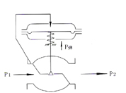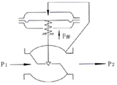 閥前壓力控制(K),其初始閥芯的位置在關閉狀態。當閥前壓力P1通過閥芯、閥座的節流后變為閥后壓力P2,同時P1通過管線輸入上膜室作用在膜片上,其作用力與彈簧的反作用力相平衡時閥芯位置決定了閥的開度,從而控制閥前壓力。 當閥前壓力P1增加時,P1作用在膜片上的作用力也隨之增加。此時,膜片上的作用力大于設定彈簧的反作用力,使閥芯向離開閥座方向移動,導致閥的開度變大,流阻變小,P1向閥后泄壓,直到膜片上的作用力與彈簧反作用力相平衡為止,從而使P1降為設定值。同理,當閥前壓力P1降低時動作方向與上述相反,這就是閥前壓力調節的工作原理。