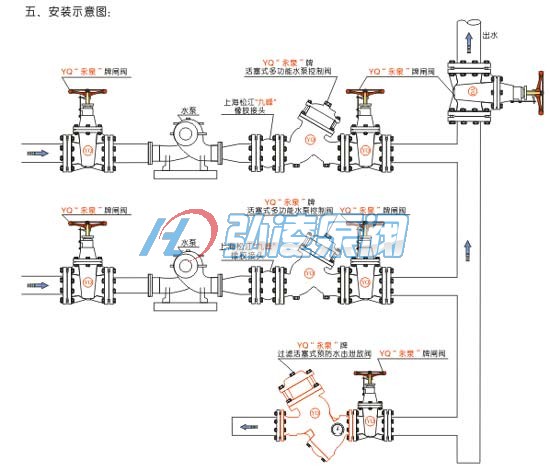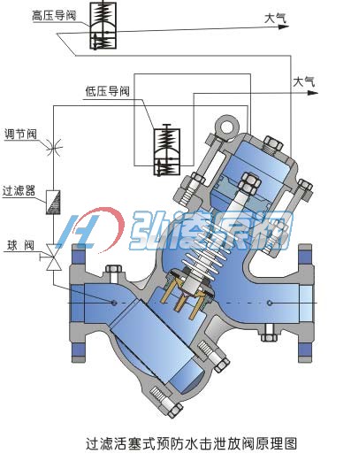 過濾活塞式預(yù)防水擊泄放閥該多用閥由一個Y型寬閥腔帶過濾器的主閥、一個三通式低壓導(dǎo)閥各一個三通式高壓導(dǎo)閥組成,當(dāng)意外斷電、水泵關(guān)機、水泵啟動等情況時,產(chǎn)生一個低壓波動,這時低壓導(dǎo)閥開啟與大氣相通,活塞上腔壓力下降,主閥開啟泄水,并在回水高壓到來時,保持找開狀態(tài),當(dāng)管網(wǎng)壓力增至工況壓力時,低壓導(dǎo)閥和主閥都緩慢關(guān)閉。